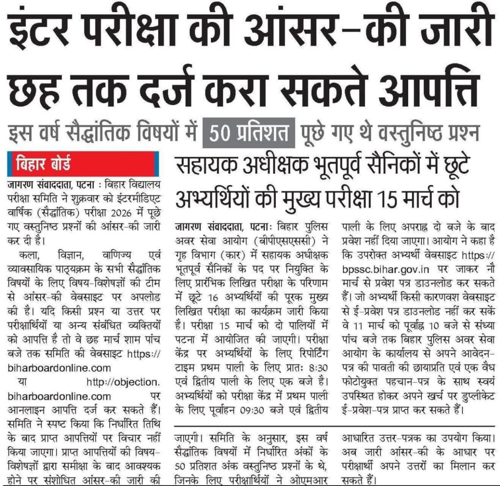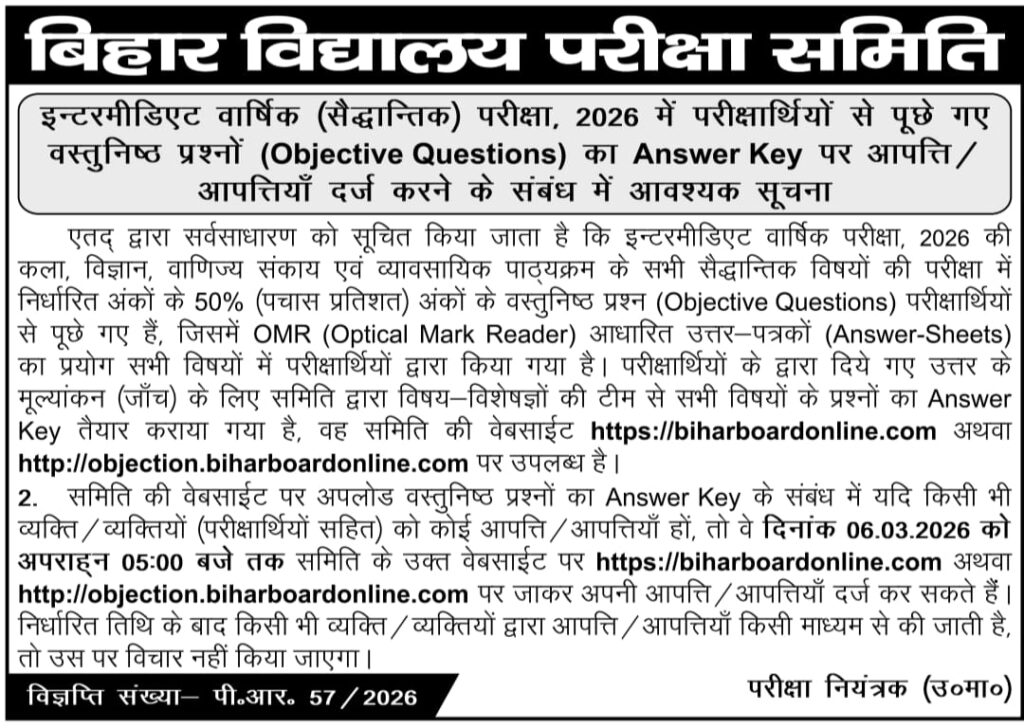 दोस्तों बिहार बोर्ड कक्षा 12वीं यानी इंटरमीडिएट परीक्षा 2026 का उत्तर कुंजी आज 28 फरवरी 2026 को जारी कर दिया गया है जिस पर ऑनलाइन के माध्यम से आपत्ति दर्ज 28 फरवरी 2026 से 5 मार्च 2026 तक कर सकते हैं।