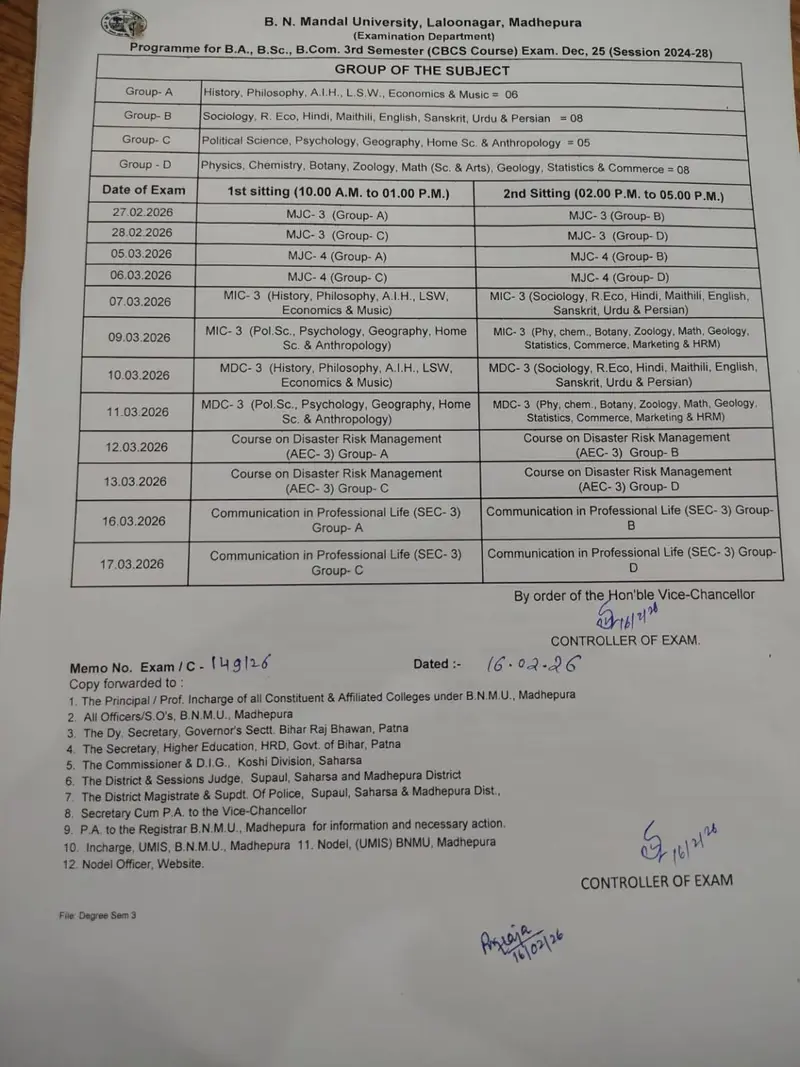 BNMU UG 3rd Semester Admit Card 2024-28 : Important Date