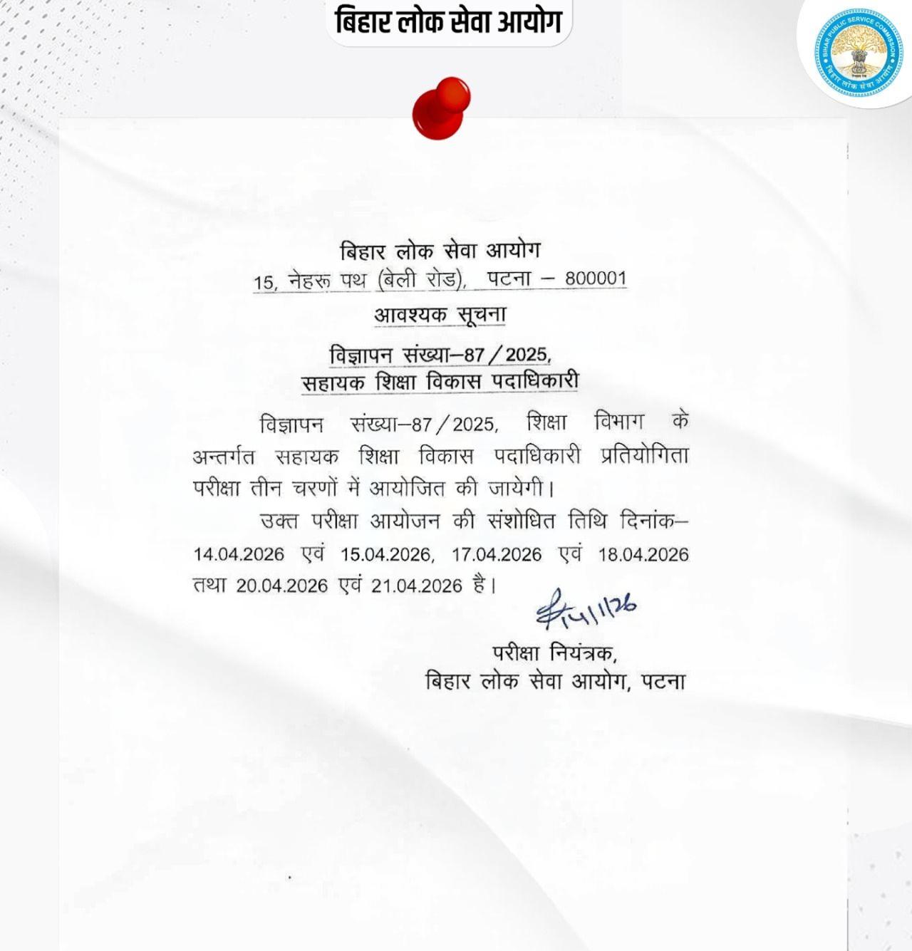 | BPSC AEDO Exam Date 2026 | 14, 15, 17, 18, 20 & 21 April 2026 |