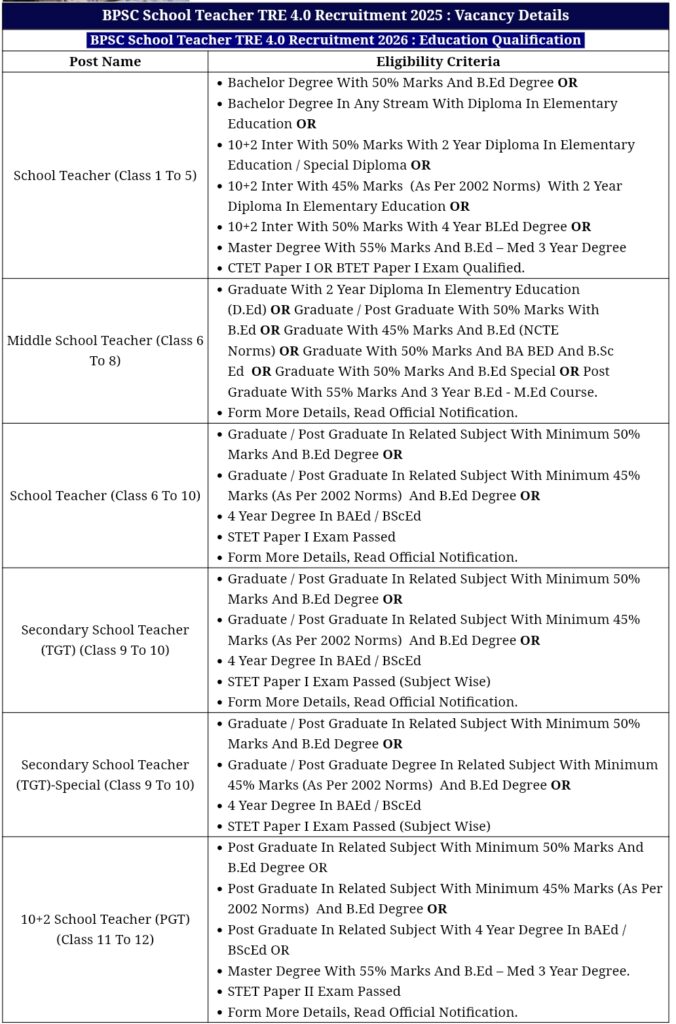 BPSC School Teacher TRE 4.0 Recruitment 2026 : Post Wise Qualification