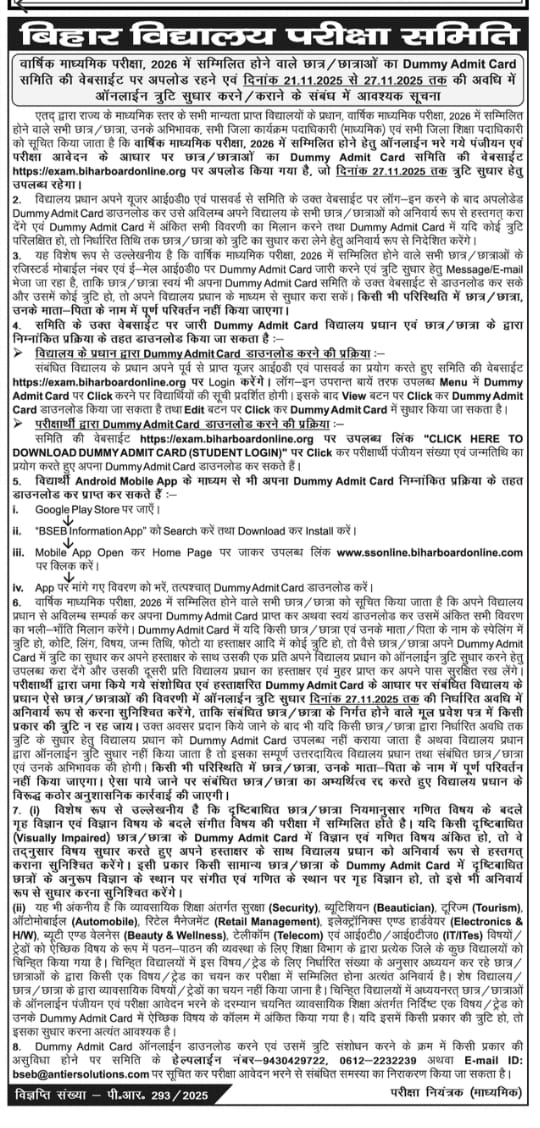 | Dummy Admit Card Correction | विद्यालय / कॉलेज से प्रधान अध्यापक के द्वारा होगा |