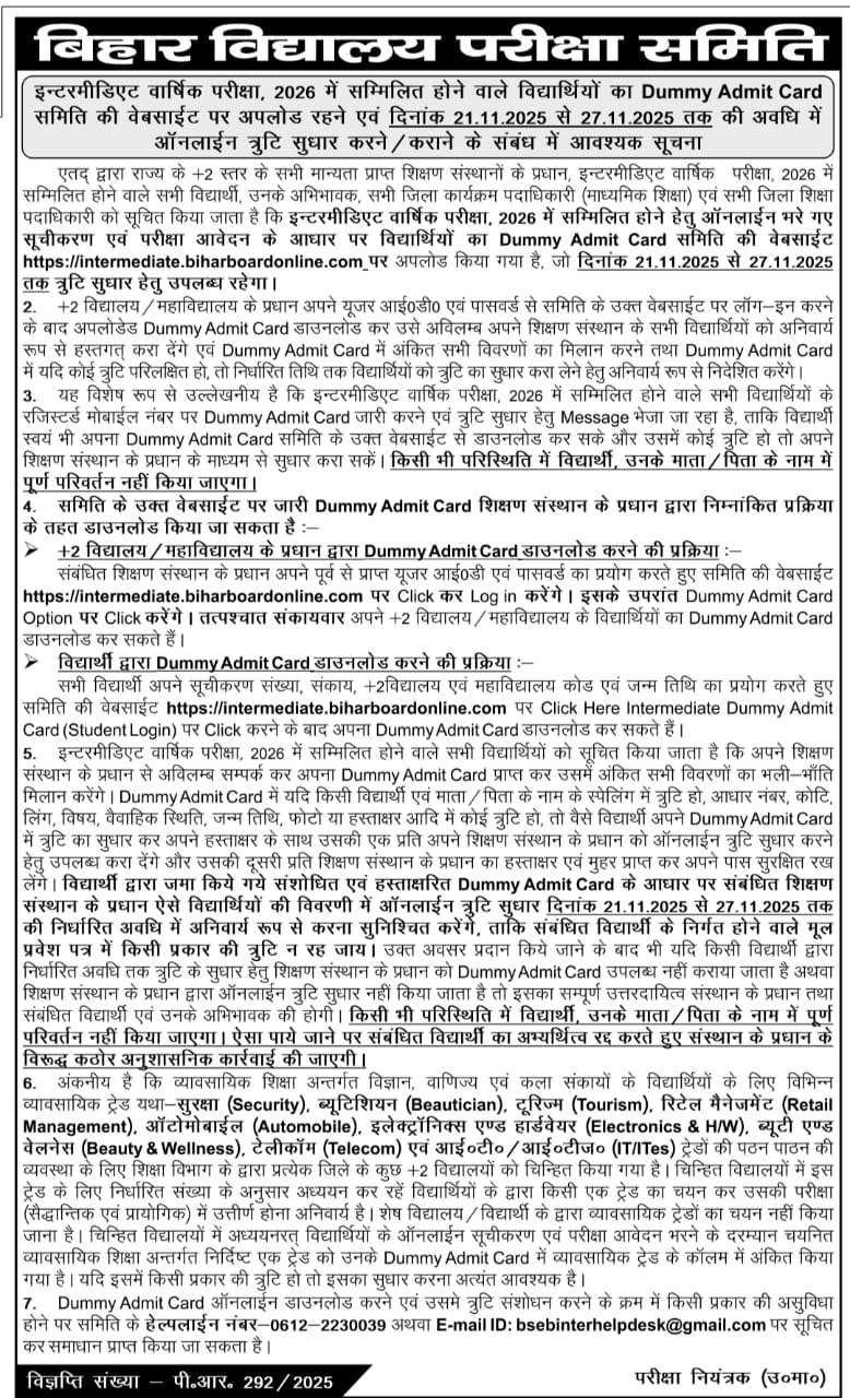 | Post Name | BSEB Bihar board 12th Dummy Admit Card 2026 |