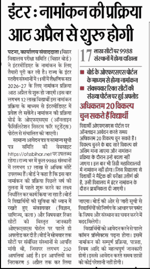 बिहार में शिक्षा के क्षेत्र में छात्रों और अभिभावकों के लिए Online Facilitation System for Students (OFSS) ने 11वीं कक्षा (Intermediate) में प्रवेश प्रक्रिया को बेहद आसान और पारदर्शी बना दिया है। 2026 में भी OFSS के माध्यम से बिहार बोर्ड से संबद्ध सरकारी और गैर-सरकारी कॉलेजों/स्कूलों में प्रवेश लिया जा सकता है। इस आर्टिकल में हम आपको OFSS Bihar 11वीं प्रवेश 2026 के बारे में पूरी जानकारी देंगे, जिसमें पात्रता, आवेदन प्रक्रिया, फीस, चयन प्रक्रिया और महत्वपूर्ण तिथियाँ शामिल हैं।
