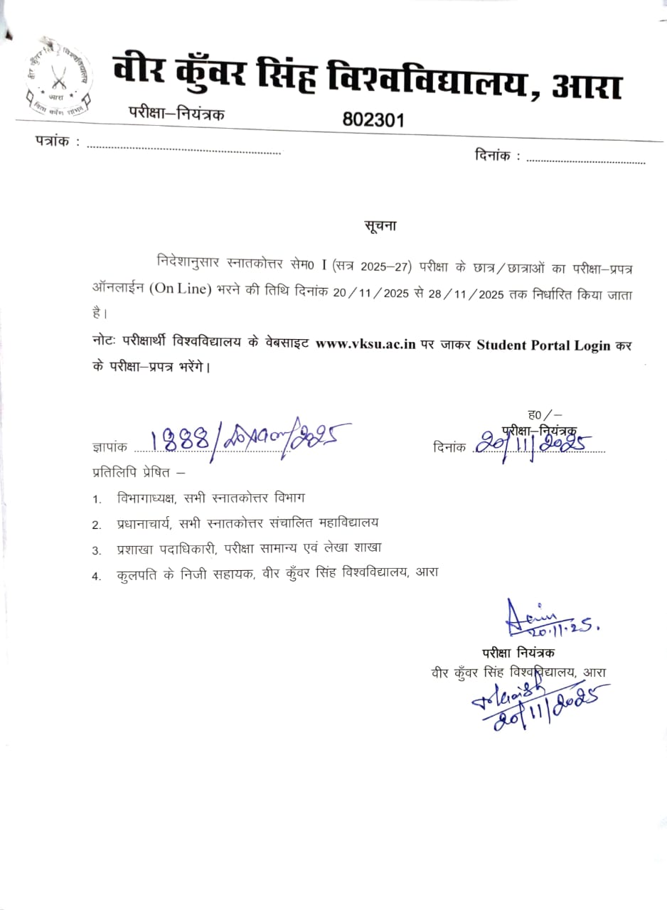 VKSU PG Semester 1 Exam Form 2025-27 : VKSU PG Semester 1 Exam Form 2025-27 Fill Up Link
