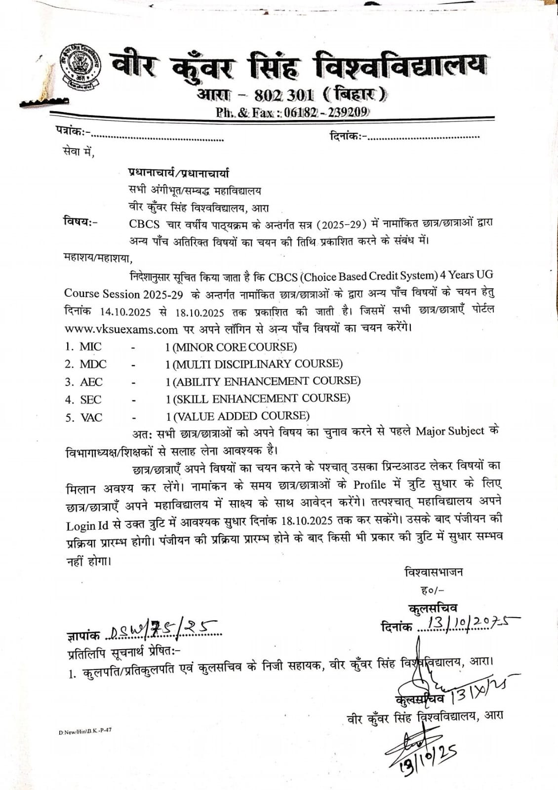निदेशानुसार सूचित किया जाता है कि CBCS (Choice Based Credit System) 4 Years UG Course Session 2025-29 के अन्तर्गत नामांकित छात्र/छात्राओं के द्वारा अन्य पाँच विषयों के चयन हेतु दिनांक 14.10.2025 से 18.10.2025 तक प्रकाशित की जाती है। जिसमें सभी छात्र/छात्राएँ पोर्टल www.vksuexams.com पर अपने लॉगिन से अन्य पाँच विषयों का चयन करेंगे, जो कुछ इस प्रकार से है:-