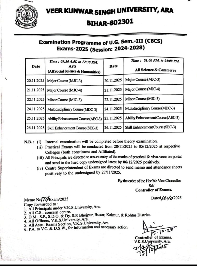 VKSU UG Semester 3 Admit Card 2024-28 : Examination Programme