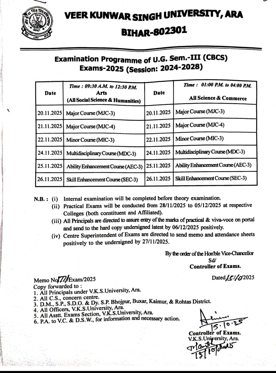 VKSU UG Semester 3 Admit Card 2024-28 : Examination Programme