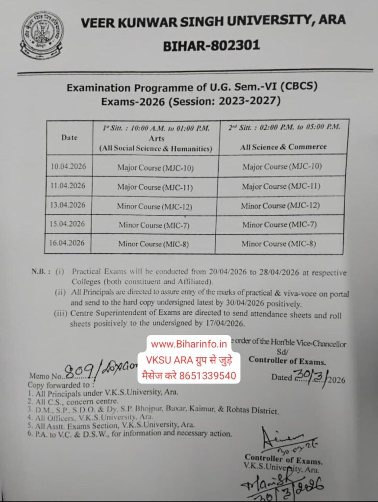 VKSU UG Semester 6 Exam Form 2023–27 : Veer Kunwar Singh University (VKSU), Ara releases examination forms for undergraduate students every semester. Students pursuing B.A., B.Sc., and B.Com under the 2023–2027 session must fill out the VKSU UG Semester 6 Exam Form to appear in their final semester examination. This article provides a complete and detailed guide about the VKSU UG Semester 6 Exam Form 2023–27, including important dates, eligibility criteria, required documents, application process, fees, and other essential instructions.